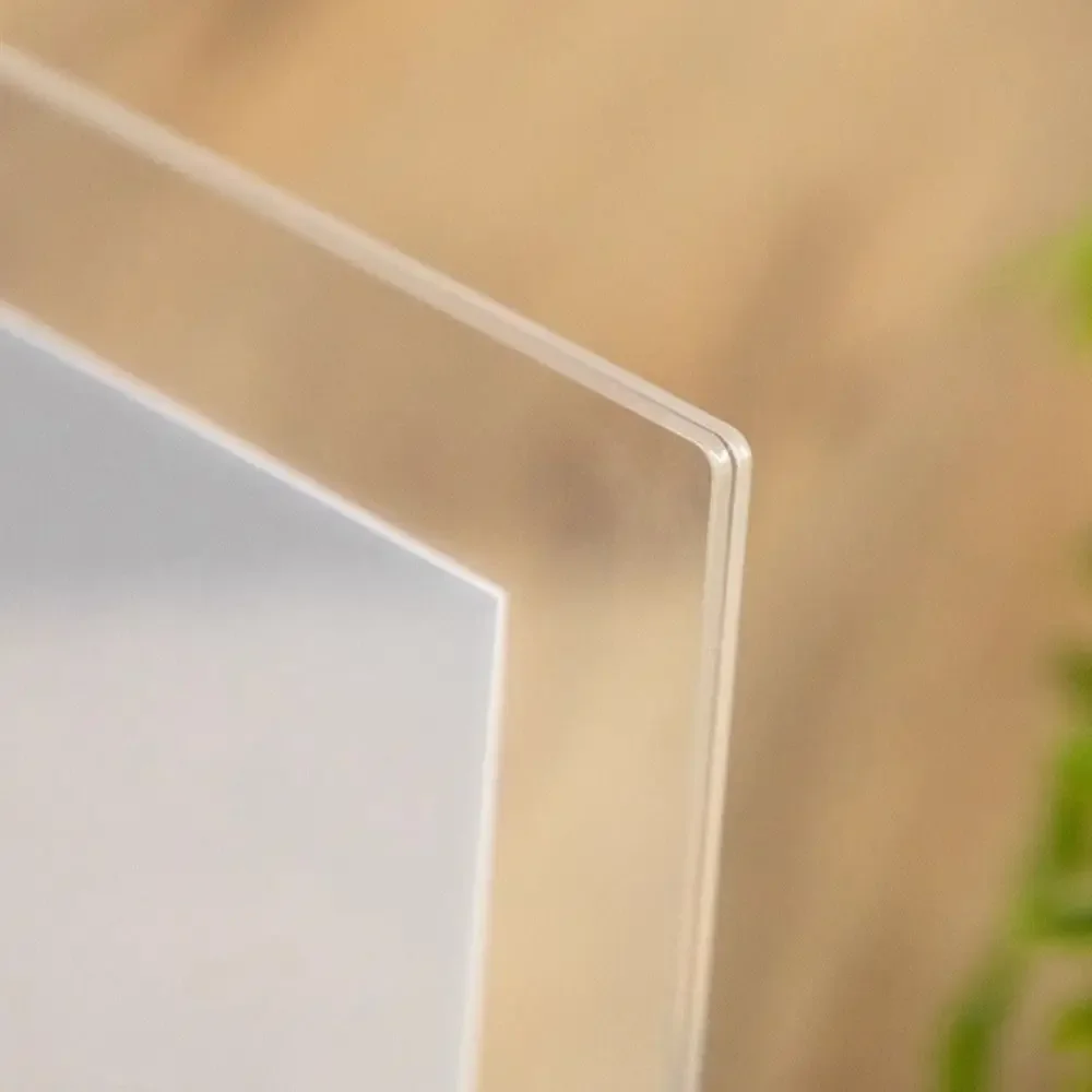 Cada moldura é equipada com duas placas de acrílico altamente transparentes, que são mais transparentes, flexíveis, fortes e inquebráveis que o vidro, facilitando a fixação das fotos e a fixação na base.